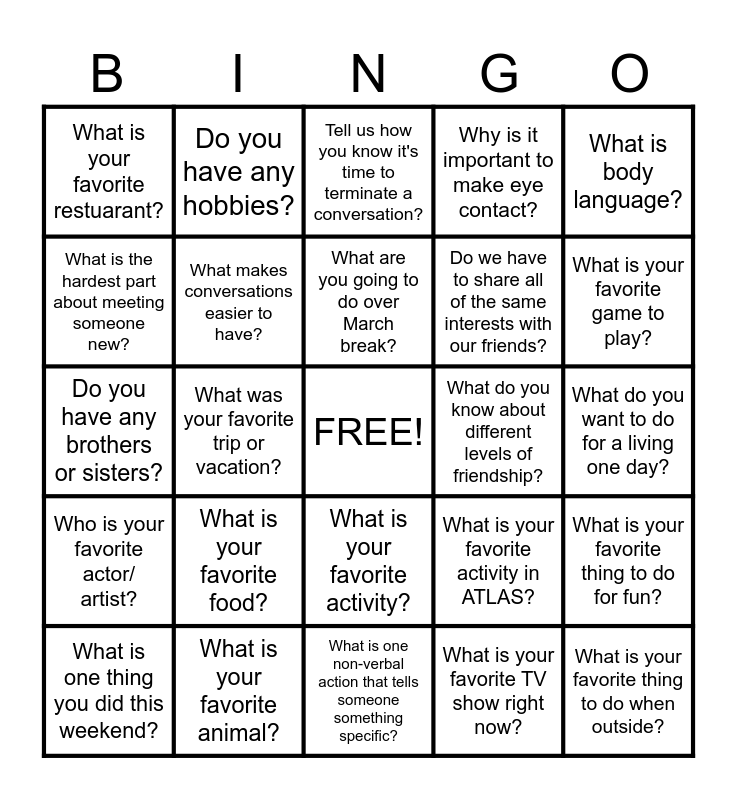 This bingo card has a free space and 24 words: What is your favorite food?, What is your favorite animal?, What are you going to do over March break?, What is one thing you did this weekend?, What is body language?, What is your favorite restuarant?, What is the hardest part about meeting someone new?, Do you have any hobbies?, What do you know about different levels of friendship?, What is your favorite activity?, Do we have to share all of the same interests with our friends?, Do you have any brothers or sisters?, What is your favorite activity in ATLAS?, What is your favorite thing to do for fun?, What makes conversations easier to have?, What is your favorite TV show right now?, What do you want to do for a living one day?, Tell us how you know it's time to terminate a conversation?, What is your favorite game to play?, What was your favorite trip or vacation?, What is your favorite thing to do when outside?, Who is your favorite actor/ artist?, Why is it important to make eye contact? and What is one non-verbal action that tells someone something specific?.