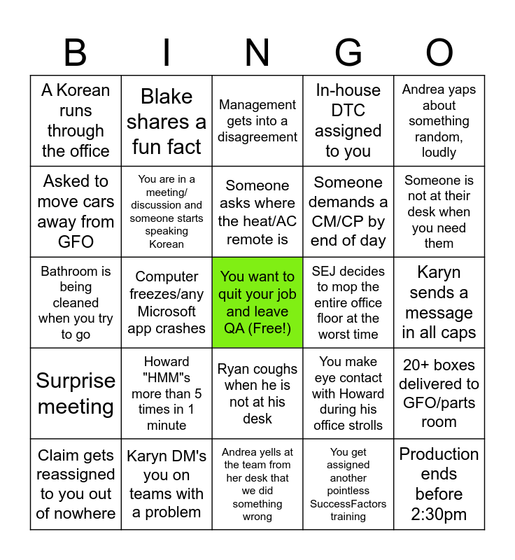 This bingo card has a free space and 24 words: Howard "HMM"s more than 5 times in 1 minute, Karyn DM's you on teams with a problem, Someone asks where the heat/AC remote is, Claim gets reassigned to you out of nowhere, Andrea yaps about something random, loudly, A Korean runs through the office, Asked to move cars away from GFO, Blake shares a fun fact, SEJ decides to mop the entire office floor at the worst time, Ryan coughs when he is not at his desk, Someone demands a CM/CP by end of day, Bathroom is being cleaned when you try to go, You make eye contact with Howard during his office strolls, 20+ boxes delivered to GFO/parts room, You are in a meeting/ discussion and someone starts speaking Korean, You get assigned another pointless SuccessFactors training, Karyn sends a message in all caps, Management gets into a disagreement, Someone is not at their desk when you need them, Computer freezes/any Microsoft app crashes, Production ends before 2:30pm, Surprise meeting, In-house DTC assigned to you and Andrea yells at the team from her desk that we did something wrong.