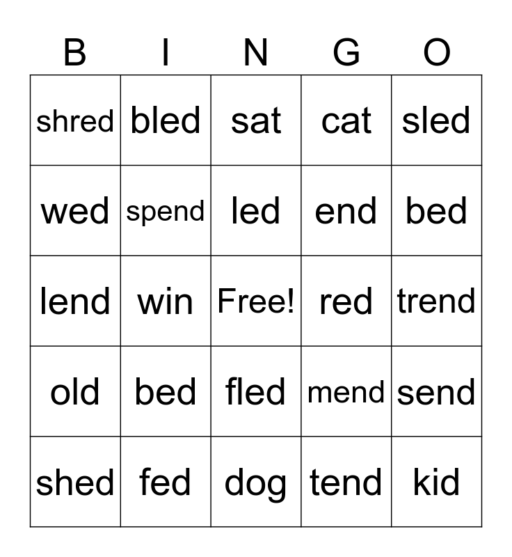 This bingo card has a free space and 24 words: bed, fed, led, shed, sled, shred, wed, bled, red, fled, end, lend, mend, send, spend, tend, trend, sat, bed, win, kid, old, cat and dog.