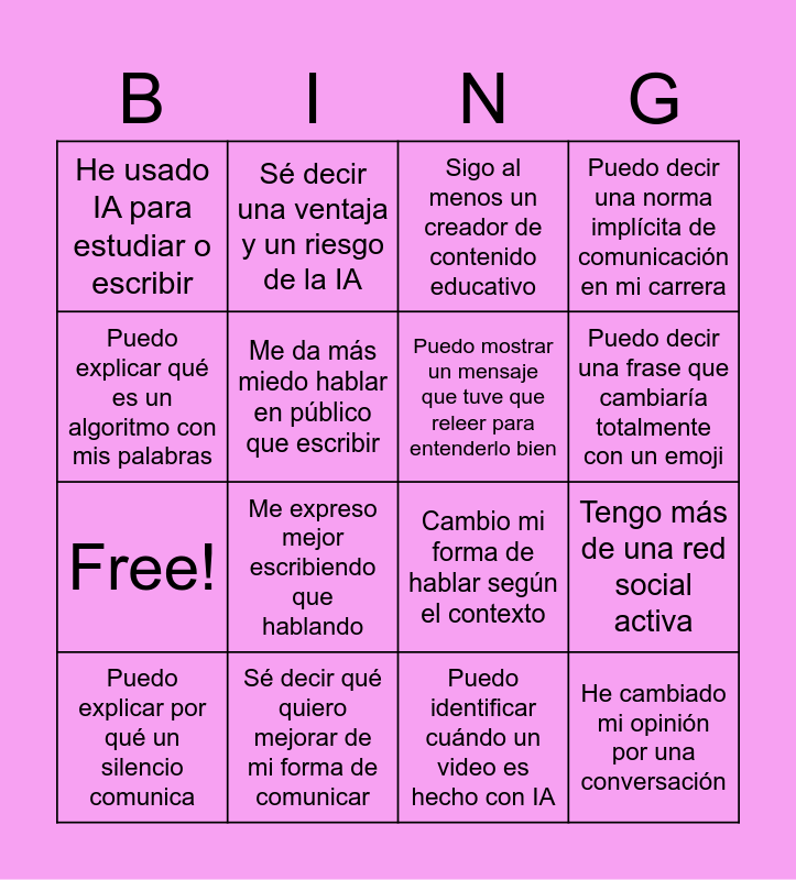 This bingo card has 20 words: Tengo más de una red social activa, Tengo más de 3 grupos silenciados en WhatsApp, Sigo al menos un creador de contenido educativo, Puedo decir una frase que sonaría mal fuera de contexto, Puedo explicar por qué un silencio comunica, Puedo explicar qué es un algoritmo con mis palabras, Sé decir qué quiero mejorar de mi forma de comunicar, He usado IA para estudiar o escribir, Free!, Sé decir una ventaja y un riesgo de la IA, Me expreso mejor escribiendo que hablando, Cambio mi forma de hablar según el contexto, Me da más miedo hablar en público que escribir, He cambiado mi opinión por una conversación, Puedo mostrar un mensaje que tuve que releer para entenderlo bien, Puedo decir una palabra que en mi carrera se usa mucho y fuera de ella no, Puedo decir una frase que cambiaría totalmente con un emoji, Puedo decir una norma implícita de comunicación en mi carrera, Puedo identificar cuándo un video es hecho con IA and Vengo con buenas expectativas de la clase.