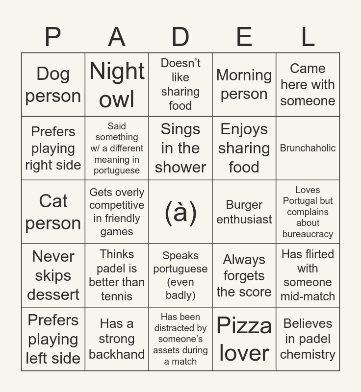 This bingo card has a free space and 29 words: Prefers playing left side, Sushi connoisseur, Gets overly competitive in friendly games, Has been frustrated by a wall bounce, Dog person, Doesn’t like sharing food, Said something w/ a different meaning in portuguese, Thinks padel is better than tennis, Burger enthusiast, Has a strong backhand, Loves Portugal but complains about bureaucracy, Believes in padel chemistry, Has been distracted by someone’s assets during a match, Pizza lover, Brunchaholic, Plays padel for fun, Speaks portuguese (even badly), Never skips dessert, Came here with someone, Cat person, Always forgets the score, Turns ‘one drink’ into a night out, Enjoys sharing food, Prefers playing right side, Morning person, Night owl, Has flirted with someone mid-match, Sings in the shower and Has traveled to 3+ countries.