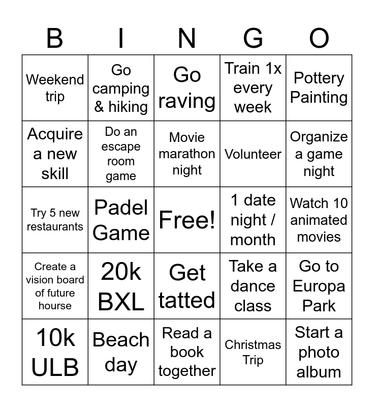 This bingo card has a free space and 24 words: 10k ULB, 20k BXL, Movie marathon night, Christmas Trip, Pottery Painting, Weekend trip, Go camping & hiking, Go raving, 1 date night / month, Watch 10 animated movies, Try 5 new restaurants, Do an escape room game, Take a dance class, Go to Europa Park, Acquire a new skill, Beach day, Read a book together, Train 1x every week, Organize a game night, Create a vision board of future hourse, Padel Game, Get tatted, Volunteer and Start a photo album.
