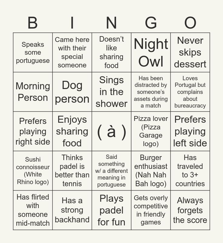 This bingo card has a free space and 30 words: Has a strong backhand, Turns ‘one drink’ into a night out, Enjoys sharing food, Has been frustrated by a wall bounce, Speaks some portuguese, Doesn’t like sharing food, Dog person, Said something w/ a different meaning in portuguese, Pizza lover (Pizza Garage logo), Plays padel for fun, Prefers playing left side, Always forgets the score, Gets overly competitive in friendly games, Cat person, Loves Portugal but complains about bureaucracy, Brunchaholic(Abigail’s logo), Burger enthusiast (Nah Nah Bah logo), Sushi connoisseur (White Rhino logo), Thinks padel is better than tennis, Never skips dessert, Prefers playing right side, Believes in padel chemistry, Came here with their special someone, Has been distracted by someone’s assets during a match, Morning Person, Night Owl, Has traveled to 3+ countries, Has flirted with someone mid-match, Sings in the shower and Happily single.