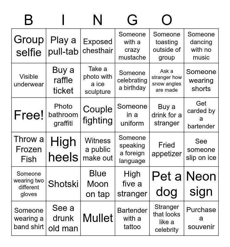 This bingo card has 36 words: High five a stranger, Blue Moon on tap, Bartender with a tattoo, Visible underwear, Throw a Frozen Fish, Someone in a uniform, Buy a raffle ticket, Mullet, Someone toasting outside of group, Pet a dog, Someone wearing shorts, Someone with a crazy mustache, Neon sign, Photo bathroom graffiti, Someone celebrating a birthday, Group selfie, Someone wearing two different gloves, Buy a drink for a stranger, Free!, Exposed chesthair, Couple fighting, High heels, Someone speaking a foreign language, Witness a public make out, Fried appetizer, Play a pull-tab, Ask a stranger how snow angles are made, See a drunk old man, Take a photo with a ice sculpture, Someone dancing with no music, Purchase a souvenir, Someone wearing a band shirt, See someone slip on ice, Get carded by a bartender, Shotski and Stranger that looks like a celebrity.