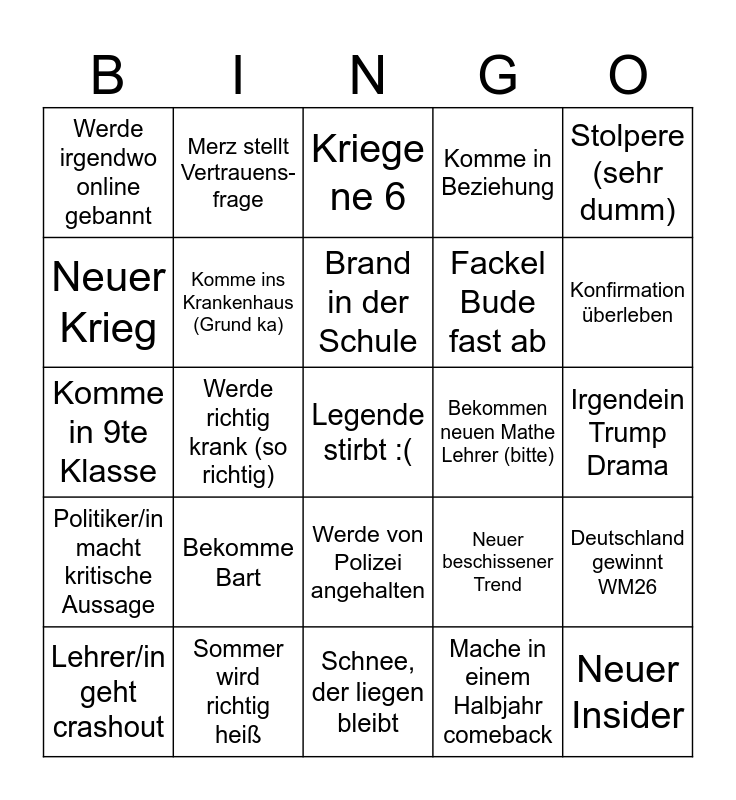 This bingo card has a free space and 24 words: Lehrer/in geht crashout, Bekomme Bart, Brand in der Schule, Mache in einem Halbjahr comeback, Stolpere (sehr dumm), Werde irgendwo online gebannt, Merz stellt Vertrauens- frage, Kriege ne 6, Bekommen neuen Mathe Lehrer (bitte), Irgendein Trump Drama, Komme in 9te Klasse, Komme ins Krankenhaus (Grund ka), Neuer beschissener Trend, Deutschland gewinnt WM26, Neuer Krieg, Sommer wird richtig heiß, Schnee, der liegen bleibt, Komme in Beziehung, Konfirmation überleben, Politiker/in macht kritische Aussage, Werde richtig krank (so richtig), Werde von Polizei angehalten, Fackel Bude fast ab and Neuer Insider.