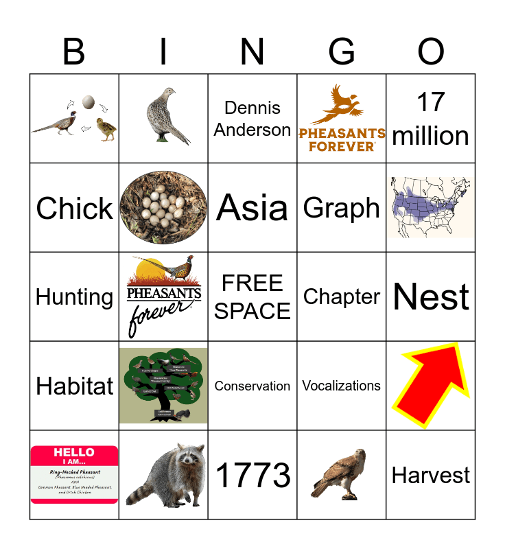 This bingo card has 12 images, a free space and 16 words: 1982, Graph, Chick, Dennis Anderson, Habitat, Chapter, Hunting, 1773, Birds, Asia, Conservation, Harvest, Nest, Vocalizations, 17 million and 73.