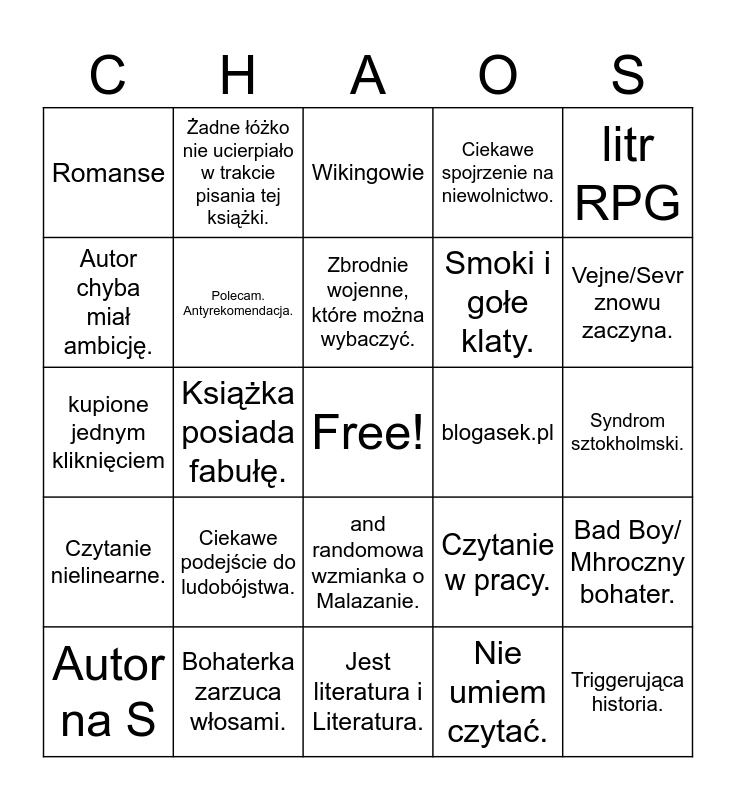 This bingo card has a free space and 29 words: Autor na S, Pratchett, Książka posiada fabułę., Bohaterka schodzi na śniadanie., Romanse, Wikingowie, Polecam. Antyrekomendacja., Ciekawe podejście do ludobójstwa., blogasek.pl, Bohaterka zarzuca włosami., Syndrom sztokholmski., Triggerująca historia., Jest literatura i Literatura., Nie umiem czytać., Vejne/Sevr znowu zaczyna., Wulgaryzmy, and randomowa wzmianka o Malazanie., Czytanie nielinearne., litr RPG, kupione jednym kliknięciem, Czytanie w pracy., Nie polecam, rekomendacja., Smoki i gołe klaty., Autor chyba miał ambicję., Ciekawe spojrzenie na niewolnictwo., Żadne łóżko nie ucierpiało w trakcie pisania tej książki., Bad Boy/ Mhroczny bohater., Zbrodnie wojenne, które można wybaczyć. and Scena seksu, ale to wyjątek..