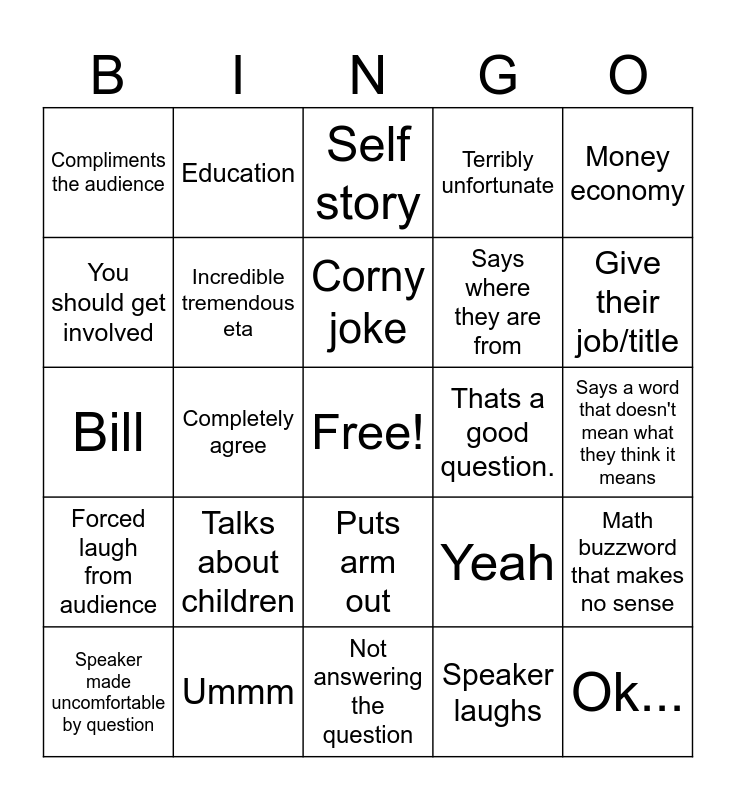 This bingo card has a free space and 24 words: Talks about children, Ummm, Corny joke, Speaker made uncomfortable by question, Money economy, Compliments the audience, You should get involved, Education, Thats a good question., Puts arm out, Says where they are from, Bill, Yeah, Math buzzword that makes no sense, Incredible tremendous eta, Speaker laughs, Says a word that doesn't mean what they think it means, Self story, Give their job/title, Completely agree, Ok..., Forced laugh from audience, Terribly unfortunate and Not answering the question.