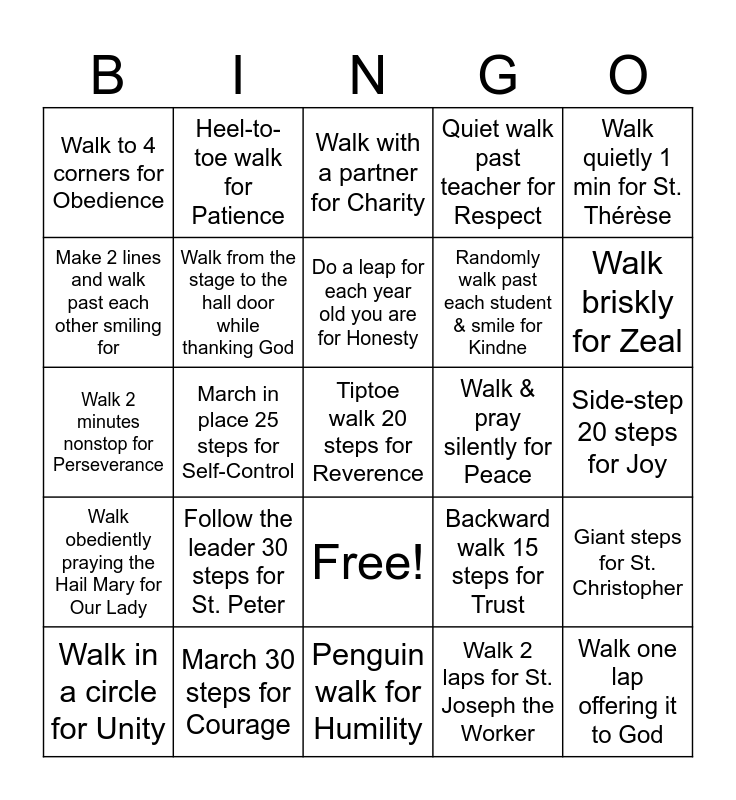 This bingo card has 26 words: Free!, Walk 2 laps for St. Joseph the Worker, Do a leap for each year old you are for Honesty, March 30 steps for Courage, Walk quietly 1 min for St. Thérèse, Walk to 4 corners for Obedience, Make 2 lines and walk past each other smiling for, Heel-to-toe walk for Patience, Side-step 20 steps for Joy, Backward walk 15 steps for Trust, Randomly walk past each student & smile for Kindne, Walk 2 minutes nonstop for Perseverance, Giant steps for St. Christopher, Walk in a circle for Unity, March in place 25 steps for Self-Control, Walk with arms swinging for Strength, Quiet walk past teacher for Respect, Walk obediently praying the Hail Mary for Our Lady, Walk with a partner for Charity, Tiptoe walk 20 steps for Reverence, Walk briskly for Zeal, Penguin walk for Humility, Walk & pray silently for Peace, Follow the leader 30 steps for St. Peter, Walk from the stage to the hall door while thanking God and Walk one lap offering it to God.