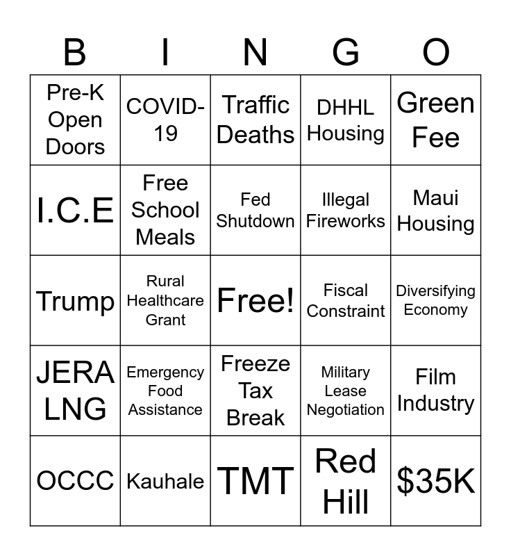 This bingo card has a free space and 25 words: Emergency Food Assistance, TMT, Fed Shutdown, OCCC, Green Fee, Pre-K Open Doors, I.C.E, COVID-19, Fiscal Constraint, Freeze Tax Break, Illegal Fireworks, Trump, Military Lease Negotiation, Film Industry, Free School Meals, Operation Hire, Diversifying Economy, Traffic Deaths, Maui Housing, Rural Healthcare Grant, $35K, Kauhale, JERA LNG, DHHL Housing and Red Hill.