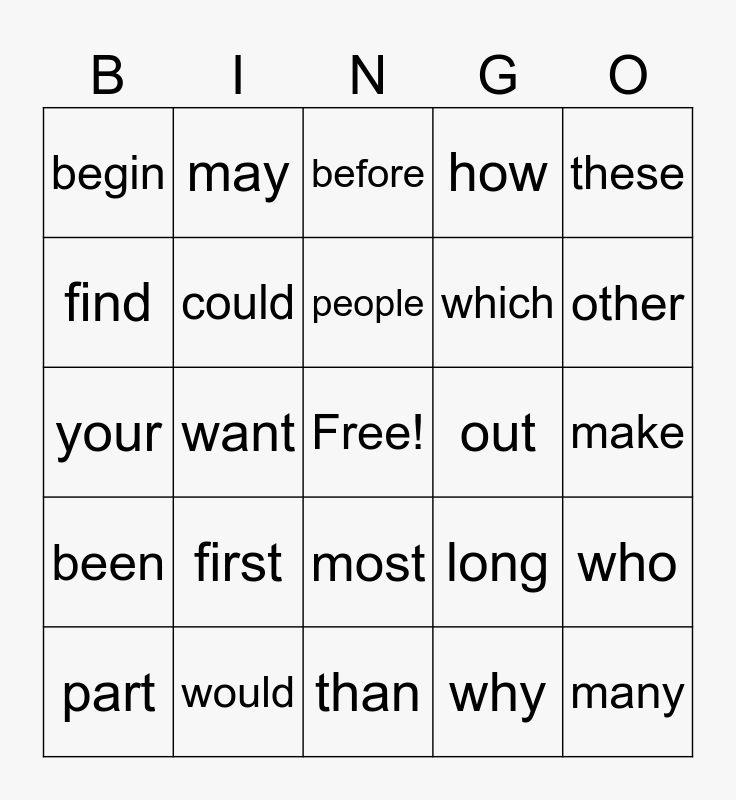 This bingo card has a free space and 24 words: first, would, people, part, these, begin, find, may, out, most, which, your, long, who, could, why, make, before, other, want, many, been, how and than.