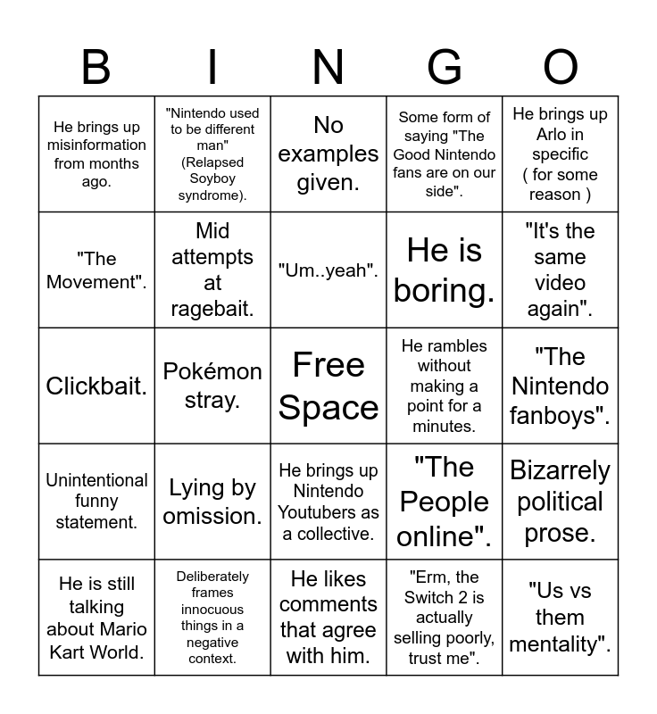 This bingo card has a free space and 24 words: Lying by omission., Deliberately frames innocuous things in a negative context., "Um..yeah"., He is still talking about Mario Kart World., He brings up Arlo in specific ( for some reason ), He brings up misinformation from months ago., "The Movement"., "Nintendo used to be different man" (Relapsed Soyboy syndrome)., He rambles without making a point for a minutes., He brings up Nintendo Youtubers as a collective., He is boring., Clickbait., "The People online"., Bizarrely political prose., Mid attempts at ragebait., "Erm, the Switch 2 is actually selling poorly, trust me"., "The Nintendo fanboys"., No examples given., "It's the same video again"., Pokémon stray., "Us vs them mentality"., Unintentional funny statement., Some form of saying "The Good Nintendo fans are on our side". and He likes comments that agree with him..