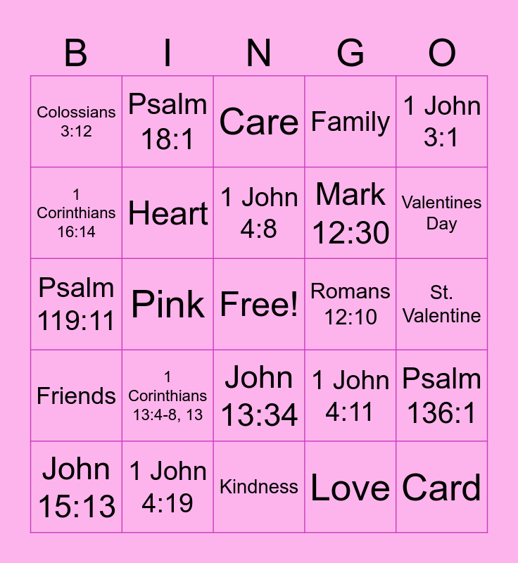 This bingo card has a free space and 24 words: 1 Corinthians 13:4-8, 13, 1 John 4:19, 1 John 4:8, John 15:13, 1 John 3:1, Colossians 3:12, 1 Corinthians 16:14, Psalm 18:1, Romans 12:10, John 13:34, Mark 12:30, Psalm 119:11, 1 John 4:11, Psalm 136:1, Heart, Love, St. Valentine, Care, Valentines Day, Pink, Card, Friends, Family and Kindness.