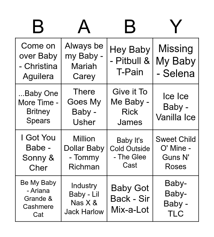 This bingo card has 26 words: Free!, Baby - Justin Bieber, Ice Ice Baby - Vanilla Ice, Baby Shark - Pinkfong, ...Baby One More Time - Britney Spears, Come on over Baby - Christina Aguilera, There Goes My Baby - Usher, Always be my Baby - Mariah Carey, Baby Got Back - Sir Mix-a-Lot, Real Love Baby - Father John Misty, I Got You Babe - Sonny & Cher, Baby It's Cold Outside - The Glee Cast, Baby Boy - Beyonce & Sean Paul, Someone Else Calling You Baby - Luke Bryan, Sweet Child O' Mine - Guns N' Roses, Born This Way - Lady Gaga, Missing My Baby - Selena, Baby-Baby-Baby - TLC, Hey Baby - Pitbull & T-Pain, Be My Baby - Ariana Grande & Cashmere Cat, Million Dollar Baby - Tommy Richman, Runaway Baby - Bruno Mars, Industry Baby - Lil Nas X & Jack Harlow, Baby, I Love Your Way - Peter Frampton, Give it To Me Baby - Rick James and Baby Don't Lie - Gwen Stefani.
