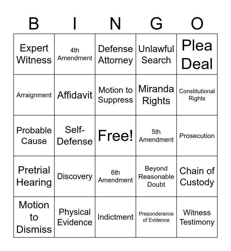 This bingo card has a free space and 25 words: Discovery, Indictment, Motion to Suppress, Motion to Dismiss, Plea Deal, Expert Witness, Arraignment, 4th Amendment, 5th Amendment, 6th Amendment, Miranda Rights, Probable Cause, Beyond Reasonable Doubt, Chain of Custody, Affidavit, Grand Jury, Prosecution, Defense Attorney, Constitutional Rights, Self-Defense, Witness Testimony, Physical Evidence, Pretrial Hearing, Unlawful Search and Preponderance of Evidence.