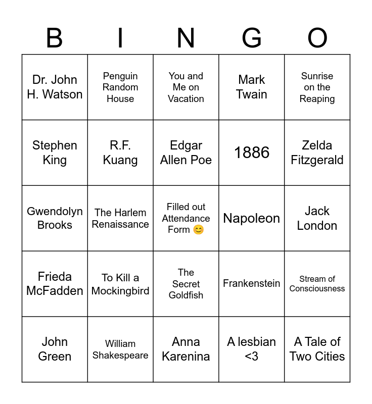 This bingo card has a free space and 24 words: To Kill a Mockingbird, William Shakespeare, Edgar Allen Poe, John Green, Sunrise on the Reaping, Dr. John H. Watson, Stephen King, Penguin Random House, Napoleon, The Secret Goldfish, 1886, Gwendolyn Brooks, Frankenstein, Stream of Consciousness, R.F. Kuang, A lesbian <3, Jack London, You and Me on Vacation, Zelda Fitzgerald, The Harlem Renaissance, A Tale of Two Cities, Frieda McFadden, Mark Twain and Anna Karenina.