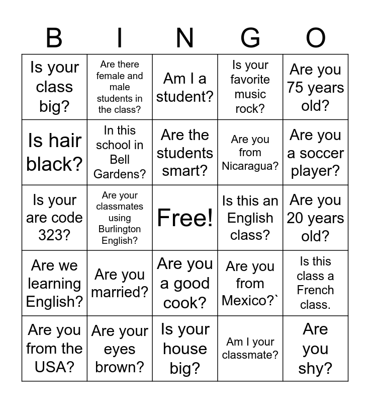 This bingo card has a free space and 24 words: Are you from the USA?, Are you married?, Are the students smart?, Am I your classmate?, Are you 75 years old?, Is your class big?, Are there female and male students in the class?, Am I a student?, Is this an English class?, Are you 20 years old?, Is your are code 323?, In this school in Bell Gardens?, Are you from Mexico?`, Is this class a French class., Is hair black?, Are your eyes brown?, Is your house big?, Is your favorite music rock?, Are you a soccer player?, Are we learning English?, Are your classmates using Burlington English?, Are you a good cook?, Are you from Nicaragua? and Are you shy?.