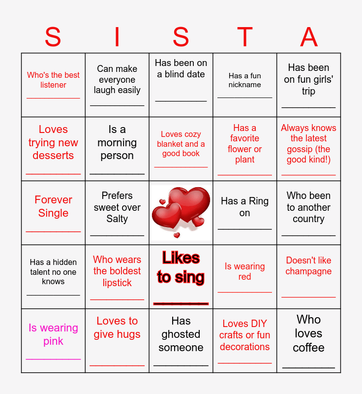 This bingo card has a free space and 29 words: Is in a relationship __________, Loves to give hugs _________, Has been on a blind date __________, Queen of dating apps _________, Has been on fun girls' trip __________, Who's the best listener ____________, Is a morning person _________, Loves cozy blanket and a good book ____________, Has a Ring on __________, Doesn't like champagne ___________, Is wearing pink _________, Prefers sweet over Salty __________, Loves DIY crafts or fun decorations __________, Who loves coffee ________, Forever Single _________, Who loves chocolate _________, Has ghosted someone _________, Is wearing red ___________, Always knows the latest gossip (the good kind!) ___________, Has a hidden talent no one knows ____________, Who wears the boldest lipstick __________, Born in February ________, Has a favorite flower or plant ___________, Who been to another country __________, Loves trying new desserts _________, Can make everyone laugh easily ___________, Likes to sing ______, Has a fun nickname _____________ and Loves wine, mocktails, or fancy drinks ____________.