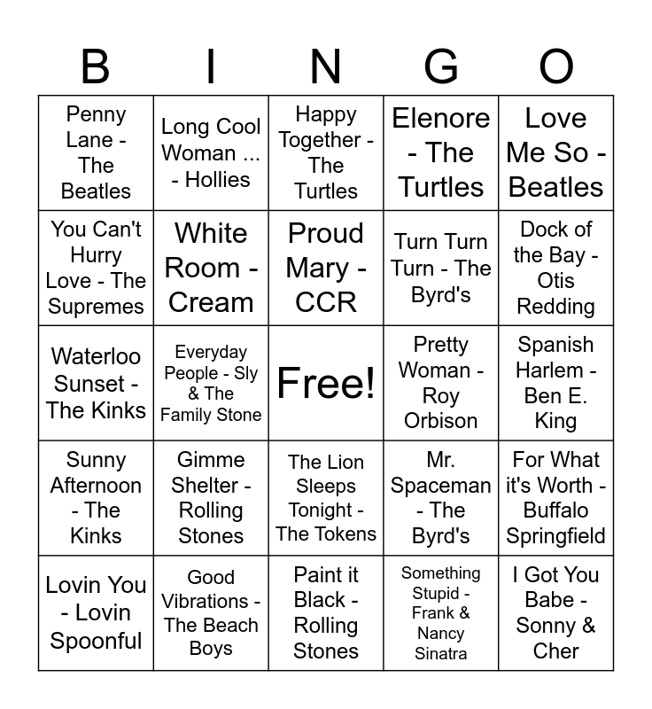 This bingo card has a free space and 40 words: Windy - The Association, Waterloo Sunset - The Kinks, 8 Days a Week - The Beatles, White Room - Cream, Good Vibrations - The Beach Boys, The Lion Sleeps Tonight - The Tokens, Proud Mary - CCR, Mrs. Robinson - Simon & Garfunkel, Love Me So - Beatles, Sunny Afternoon - The Kinks, Everyday People - Sly & The Family Stone, Elenore - The Turtles, I Got You Babe - Sonny & Cher, Spanish Harlem - Ben E. King, Pretty Woman - Roy Orbison, Gimme Shelter - Rolling Stones, I Can Hear Music - Beach Boys, Penny Lane - The Beatles, Do You Believe in Magic - Lovin Spoonful, Happy Together - The Turtles, For What it's Worth - Buffalo Springfield, Something Stupid - Frank & Nancy Sinatra, Turn Turn Turn - The Byrd's, You Can't Hurry Love - The Supremes, Shake - Otis Redding, Son of a Preacher Man - Dusty Springfield, Mr Tambourine Man - The Byrd's, Suspicious Minds - Elvis, Dance to the Music - Sly Stone, Fortunate Son - CCR, Big Bird - Eddie Floyd, Lovin You - Lovin Spoonful, Bad Moon Rising - CCR, Mr. Spaceman - The Byrd's, Dock of the Bay - Otis Redding, Paint it Black - Rolling Stones, Heart of Gold - Neil Young, I Want you Back - Jackson 5, Long Cool Woman ... - Hollies and At Last - Etta James.