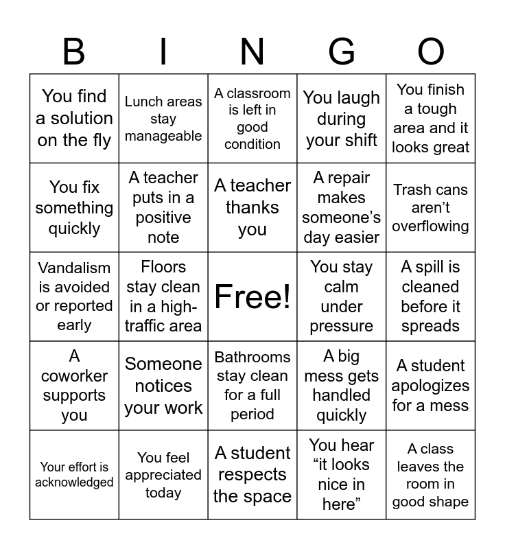 This bingo card has a free space and 42 words: A student says “thank you”, A teacher thanks you, A student helps clean up, Someone notices your work, You hear “it looks nice in here”, A student apologizes for a mess, A class leaves the room in good shape, A staff member shows appreciation, A classroom is left in good condition, Bathrooms stay clean for a full period, A spill is cleaned before it spreads, Trash cans aren’t overflowing, Floors stay clean in a high-traffic area, You finish a tough area and it looks great, You leave a space better than you found it, A big mess gets handled quickly, You prevent a mess before it happens, Vandalism is avoided or reported early, Graffiti is removed, Lunch areas stay manageable, You fix something quickly, You prevent a small issue from becoming big, You help a class continue without disruption, You find a solution on the fly, You respond fast to an unexpected issue, You complete a difficult task, A repair makes someone’s day easier, You solve a problem with limited time/resources, A work order goes smoothly, You handle a high-volume moment successfully, You’re recognized by admin, A coworker supports you, A teacher puts in a positive note, A student respects the space, Someone brings you a thank-you note, Your effort is acknowledged, You feel appreciated today, You stay calm under pressure, You take pride in your work, You leave your shift in a good mood, You laugh during your shift and You go home knowing you made a difference.