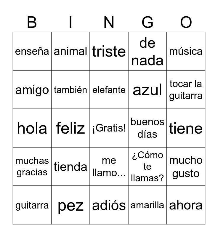 This bingo card has a free space and 24 words: tienda, pez, elefante, guitarra, música, enseña, amigo, animal, buenos días, me llamo..., azul, hola, ¿Cómo te llamas?, mucho gusto, también, amarilla, tiene, triste, tocar la guitarra, feliz, ahora, muchas gracias, de nada and adiós.