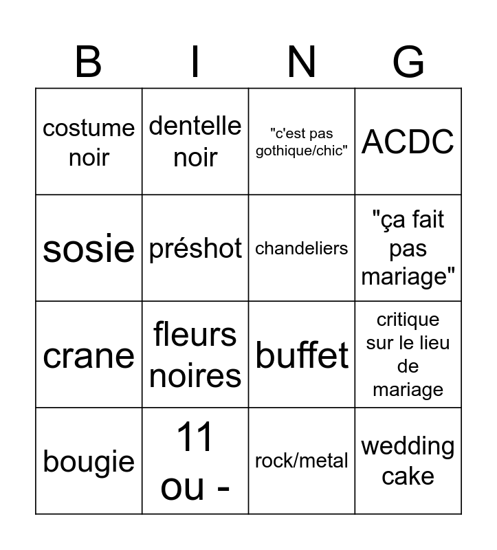 This bingo card has 16 words: 11 ou -, critique sur le lieu de mariage, "c'est pas gothique/chic", costume noir, crane, dentelle noir, buffet, rock/metal, sosie, préshot, bougie, ACDC, fleurs noires, "ça fait pas mariage", chandeliers and wedding cake.