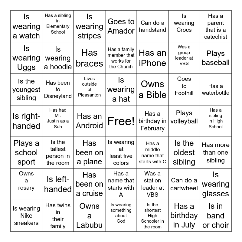 This bingo card has a free space and 48 words: Was a station leader at VBS, Was a group leader at VBS, Is wearing something about God, Has had Mr. Justin as a Sub, Lives outside of Pleasanton, Has a sibling in High School, Has a sibling in Elementary School, Has twins in their family, Is wearing Crocs, Is wearing at least five colors, Has a parent that is a catechist, Goes to Amador, Goes to Foothill, Owns a Bible, Owns a rosary, Plays volleyball, Is wearing Uggs, Plays baseball, Can do a cartwheel, Can do a handstand, Has an iPhone, Has an Android, Is wearing a watch, Is wearing a hoodie, Is wearing glasses, Has braces, Has a waterbottle, Is wearing Nike sneakers, Is wearing a hat, Has been to Disneyland, Has a birthday in July, Has a birthday in February, Has more than one sibling, Is left-handed, Is right-handed, Has a middle name that starts with C, Is the oldest sibling, Is the youngest sibling, Has been on a plane, Has been on a cruise, Plays a school sport, Is in band or choir, Is wearing stripes, Owns a Labubu, Has a family member that works for the Church, Has a name that starts with A, Is the tallest person in the room and Is the shortest High Schooler in the room.