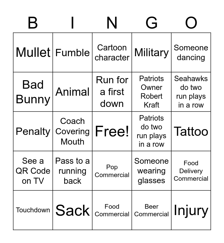 This bingo card has a free space and 34 words: Car Commercial, Beer Commercial, Celebrity Sighting, Jersey #10, See a QR Code on TV, Animal, Someone dancing, Touchdown, Fumble, Time out, Run for a first down, Cartoon character, Seahawks punt, Patriots punt, Patriots do two run plays in a row, Seahawks do two run plays in a row, Sack, Penalty, Pass to a running back, Someone wearing glasses, Pop Commercial, Field goal, Mullet, Tattoo, Food Commercial, Injury, Military, US Flag, Patriots Owner Robert Kraft, Bad Bunny, Tom Brady, Coach Covering Mouth, Food Delivery Commercial and Movie or Show Promo/Ad.