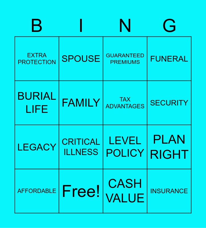 This bingo card has 25 words: PAID UP, NO BURDEN, SECURITY, CASKET, BURIAL LIFE, EXTRA PROTECTION, FAMILY, SPOUSE, Free!, WILL, LEGACY, LEVEL POLICY, CREMATION, LEVEL PREMIUM, TAX ADVANTAGES, LOVED ONE, CASH VALUE, GUARANTEED PREMIUMS, CRITICAL ILLNESS, PLAN RIGHT, AFFORDABLE, FRIENDS, INSURANCE, FUNERAL and APPLYING IS EASY.