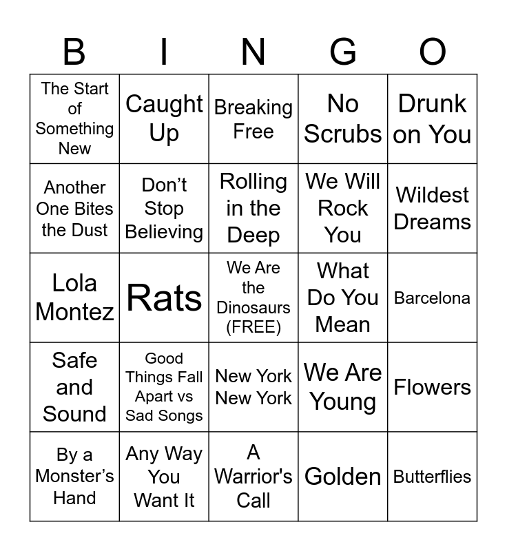 This bingo card has a free space and 24 words: Good Things Fall Apart vs Sad Songs, Any Way You Want It, Rolling in the Deep, By a Monster’s Hand, Drunk on You, The Start of Something New, Another One Bites the Dust, Caught Up, What Do You Mean, New York New York, We Will Rock You, Lola Montez, We Are Young, Flowers, Don’t Stop Believing, Golden, Barcelona, Breaking Free, Wildest Dreams, Rats, Butterflies, Safe and Sound, No Scrubs and A Warrior's Call.