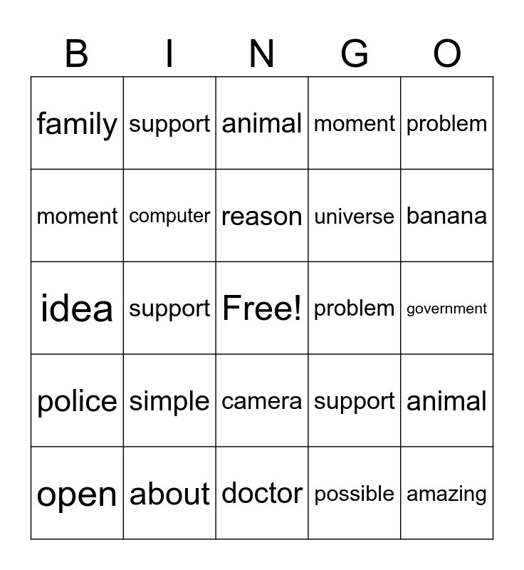 This bingo card has a free space and 30 words: about, banana, support, sofa, family, animal, computer, camera, problem, doctor, government, amazing, possible, animal, banana, camera, support, police, simple, problem, idea, animal, support, universe, moment, moment, animal, open, reason and camera.