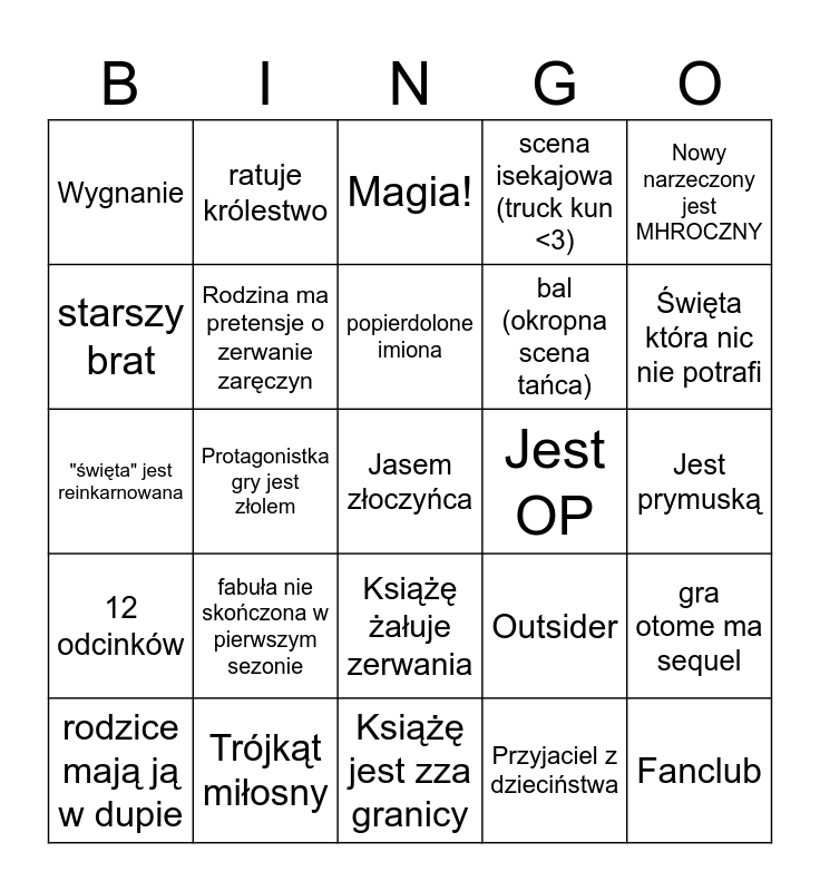 This bingo card has a free space and 30 words: Trójkąt miłosny, Harem, Protagonistka gry jest złolem, Księciuniu zrywa zaręczyny, Wygnanie, Magia!, Rodzina ma pretensje o zerwanie zaręczyn, Książę żałuje zerwania, Jest OP, Książę jest zza granicy, Jest prymuską, Fanclub, Przyjaciel z dzieciństwa, "złoczyńca" pokonuje ostatniego bossa, Święta która nic nie potrafi, Słodycze!, Outsider, 12 odcinków, fabuła nie skończona w pierwszym sezonie, Nowy narzeczony jest MHROCZNY, "święta" jest reinkarnowana, chowańce/ wkurwiające podfruwajki, ratuje królestwo, bal (okropna scena tańca), starszy brat, scena isekajowa (truck kun <3), gra otome ma sequel, rodzice mają ją w dupie, popierdolone imiona and imię od koloru/ kwiatów.