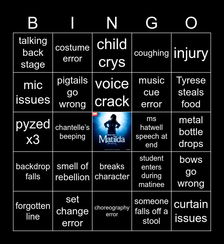 This bingo card has a free space and 24 words: smell of rebellion, set change error, voice crack, forgotten line, injury, talking back stage, mic issues, costume error, ms hatwell speech at end, breaks character, music cue error, pyzed x3, student enters during matinee, bows go wrong, pigtails go wrong, someone falls off a stool, metal bottle drops, child crys, Tyrese steals food, chantelle’s beeping, curtain issues, backdrop falls, coughing and choreography error.