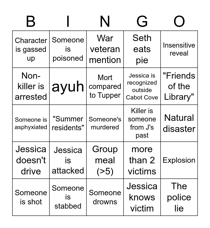 This bingo card has a free space and 36 words: Jessica corrects grammar, 698 Candlewood Lane, Jessica visits with family, ayuh, more than 2 victims, Jessica doesn't drive, Mort compared to Tupper, Pay your bills, Insensitive reveal, bemoans technology, "Summer residents", Seth eats pie, War is called anything but war, Killer is someone from J's past, "Friends of the Library", Character is gassed up, Grady appears, Jessica is attacked, The police lie, War veteran mention, Natural disaster, Explosion, Someone is stabbed, Someone is shot, Someone drowns, Someone is poisoned, Someone is asphyxiated, PoC secondary character, Jessica is recognized outside Cabot Cove, Non-killer is arrested, Stolen jewelry, JB book title, Jessica knows victim, Group meal (>5), Jessica goes for a jog and "If I only knew...".