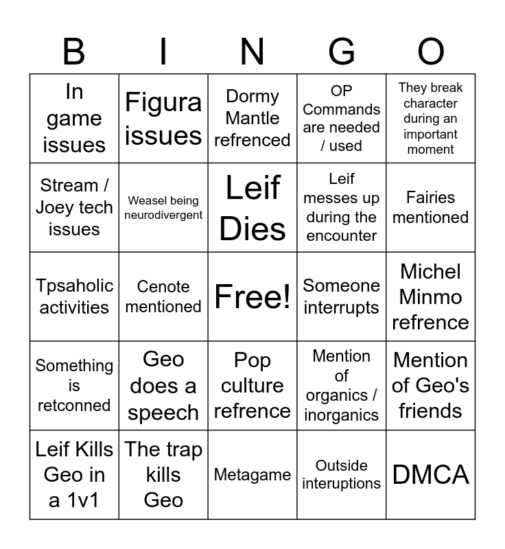 This bingo card has a free space and 24 words: Geo does a speech, The trap kills Geo, Leif Dies, Leif Kills Geo in a 1v1, They break character during an important moment, In game issues, Stream / Joey tech issues, Figura issues, Someone interrupts, Pop culture refrence, Leif messes up during the encounter, Tpsaholic activities, Mention of organics / inorganics, Mention of Geo's friends, Weasel being neurodivergent, Outside interuptions, Michel Minmo refrence, Dormy Mantle refrenced, Fairies mentioned, Cenote mentioned, DMCA, Something is retconned, OP Commands are needed / used and Metagame.