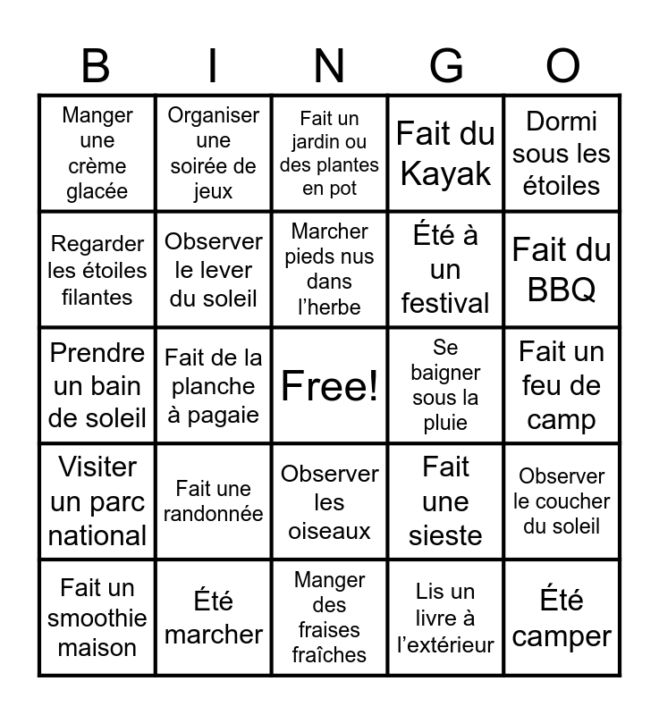 This bingo card has a free space and 37 words: Aller à la plage, Nager dans un lac, Fait un pique-nique, Observer le lever du soleil, Observer le coucher du soleil, Fait une randonnée, Marcher pieds nus dans l’herbe, Fait du vélo, Dormi sous les étoiles, Cueilli des petits fruits, Fait de la planche à pagaie, Fait du Kayak, Été camper, Fait un feu de camp, Regarder les étoiles filantes, Visiter un parc national, Été à la pêche, Fait un jardin ou des plantes en pot, Observer les oiseaux, Se baigner sous la pluie, Manger une crème glacée, Fait du BBQ, Fait un smoothie maison, Manger des fraises fraîches, Déjeuner au restaurant, Lis un livre à l’extérieur, Organiser une soirée de jeux, Fait un souper entre amis, Fait un voyage, Revoir une ami perdu de vue, Essayer le Pilate, Été marcher, Prendre un bain de soleil, Se coucher tôt, Fait une sieste, Été à un festival and Fait une soirée karaoké.