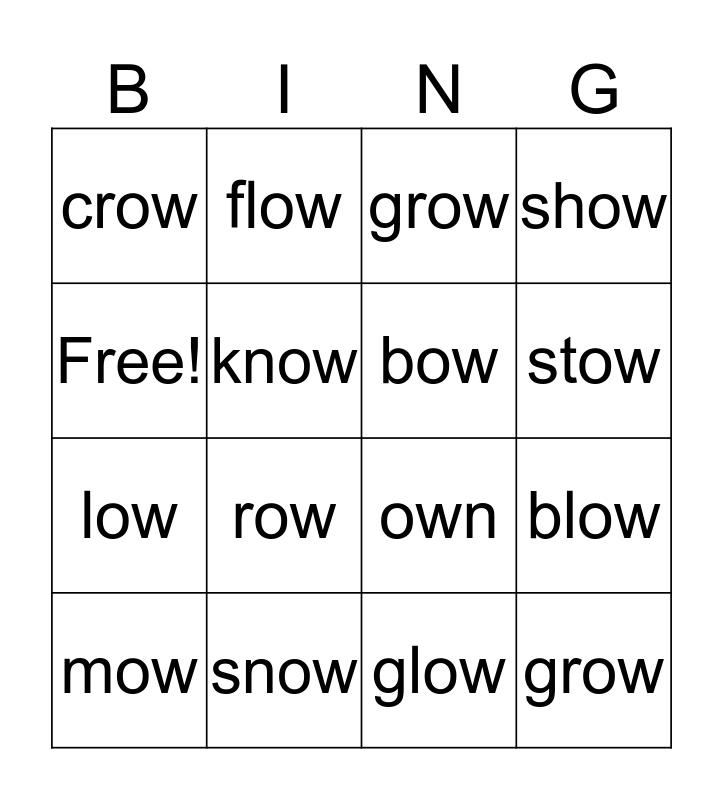This bingo card has 16 words: snow, blow, grow, crow, low, flow, own, glow, Free!, know, mow, show, row, stow, bow and grow.