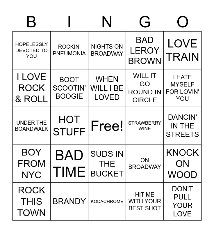 This bingo card has a free space and 54 words: DARK LADY, BOY FROM NYC, FIRE & RAIN, CHANGES IN LATTITUDES, SUDS IN THE BUCKET, PONTOON, BAD LEROY BROWN, THESE BOOTS ARE MADE FOR WALKIN', I LOVE ROCK & ROLL, THE TIDE IS HIGH, HOPELESSLY DEVOTED TO YOU, GLEN CAMPBELL, BRANDY, ROCK THIS TOWN, LOVE WILL KEEP US TOGETHER, KODACHROME, DON'T PULL YOUR LOVE, WILL IT GO ROUND IN CIRCLE, RIGHT TIME OF THE NIGHT, DANCIN' IN THE STREETS, ON BROADWAY, WAGON WHEEL, STRAWBERRY WINE, LOVE TRAIN, SPIDERS & SNAKES, ROCKIN' PNEUMONIA, LAST DANCE, HERE FOR THE PARTY, LOVE WILL TURN YOU AROUND, HIT ME WITH YOUR BEST SHOT, REDNECK WOMAN, BROWN EYED GIRL, I LOVE A RAINY NIGHT, GYPSIES TRAMPS & THIEVES, NIGHTS ON BROADWAY, DRAGGIN' THE LINE, UNDER THE BOARDWALK, KNOCK ON WOOD, ANGIE BABY, BOOT SCOOTIN' BOOGIE, I LOVE THE NIGHT LIFE, MARGARITAVILLE, BOOGIE SHOES, GO YOUR OWN WAY, BAD TIME, DELTA DAWN, GOODBYE GIRL, YOU DON'T MESS AROUND WITH JIM, WHEN WILL I BE LOVED, HOT STUFF, I HATE MYSELF FOR LOVIN' YOU, SISTER GOLDEN HAIR, CAREFREE HIGHWAY and NO SUGAR TONIGHT.