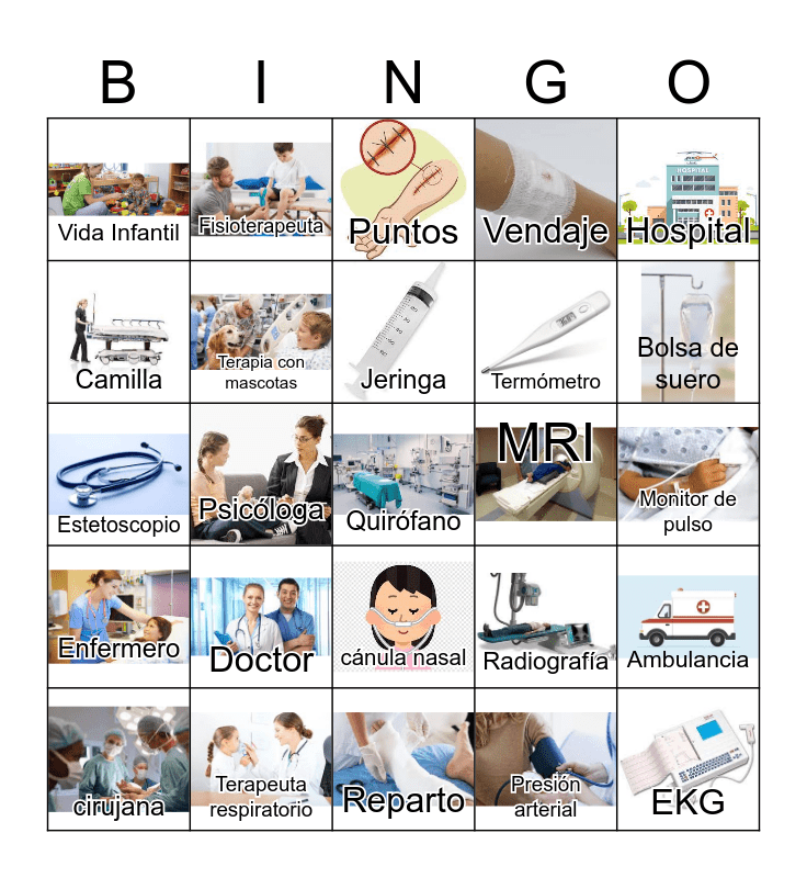 This bingo card has 25 images and 25 words: Doctor, Reparto, Jeringa, cirujana, Hospital, Vida Infantil, Camilla, Fisioterapeuta, MRI, cánula nasal, Termómetro, Estetoscopio, Radiografía, Ambulancia, Terapia con mascotas, EKG, Monitor de pulso, Puntos, Bolsa de suero, Psicóloga, Quirófano, Terapeuta respiratorio, Enfermero, Vendaje and Presión arterial.