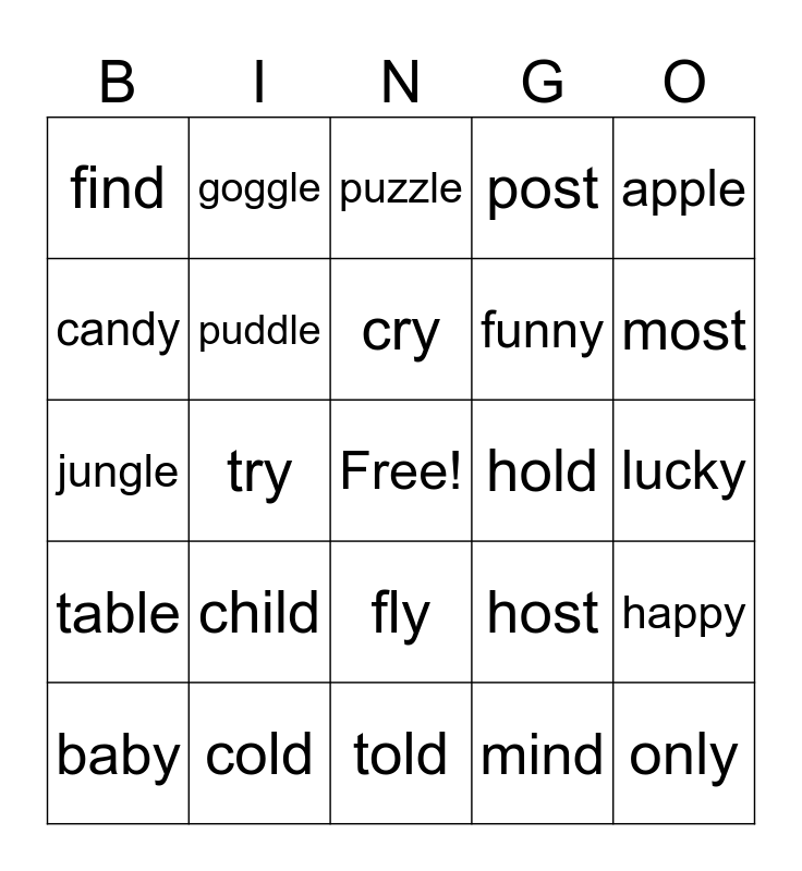 This bingo card has a free space and 24 words: child, cold, cry, baby, apple, find, candy, goggle, hold, fly, funny, jungle, host, happy, puddle, mind, lucky, puzzle, most, try, only, table, post and told.