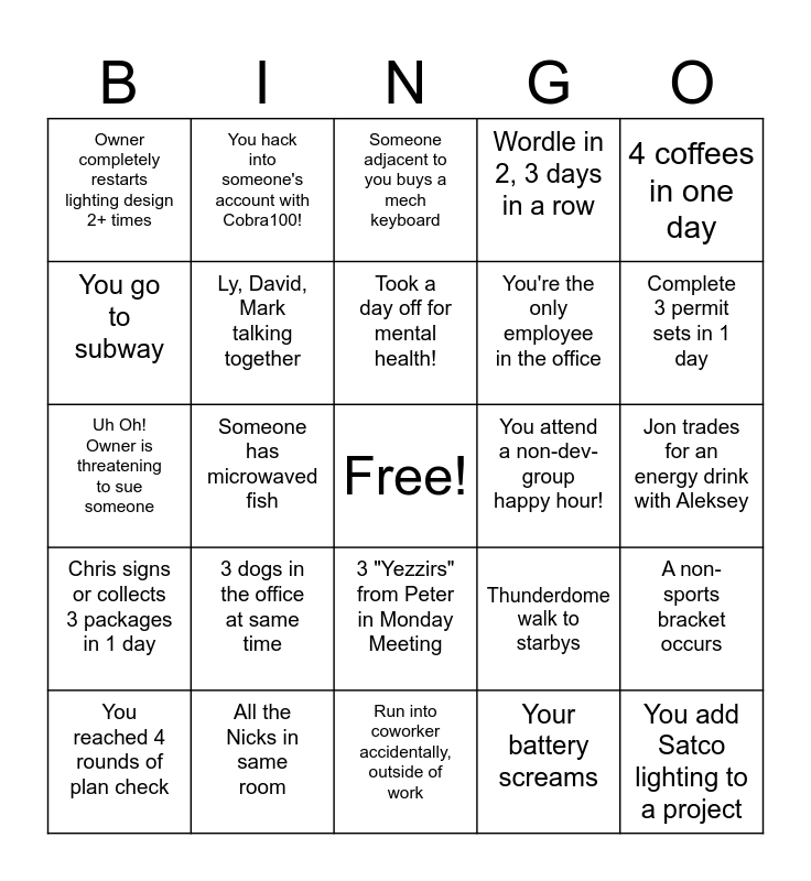 This bingo card has a free space and 28 words: A non-sports bracket occurs, 3 L&Ls in one day, You're the only employee in the office, Your battery screams, You go to subway, Someone adjacent to you buys a mech keyboard, You hack into someone's account with Cobra100!, Chris signs or collects 3 packages in 1 day, You attend a non-dev-group happy hour!, You reached 4 rounds of plan check, Uh Oh! Owner is threatening to sue someone, Wordle in 2, 3 days in a row, All the Nicks in same room, Run into coworker accidentally, outside of work, Complete 3 permit sets in 1 day, Oops more than 5 hours of meetings in 1 day, 3 dogs in the office at same time, Ly, David, Mark talking together, Took a day off for mental health!, 3 "Yezzirs" from Peter in Monday Meeting, Owner completely restarts lighting design 2+ times, Owner, arch, or contractor use comic sans, You add Satco lighting to a project, Someone has microwaved fish, Jon trades for an energy drink with Aleksey, Thunderdome walk to starbys, 4 coffees in one day and You complete 5 wordle type games in a day.