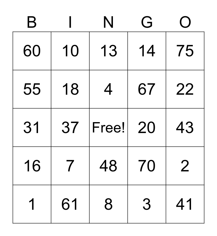 This bingo card has a free space and 24 words: 1, 7, 4, 3, 75, 60, 10, 13, 20, 43, 31, 18, 70, 2, 55, 61, 8, 14, 22, 16, 37, 48, 67 and 41.
