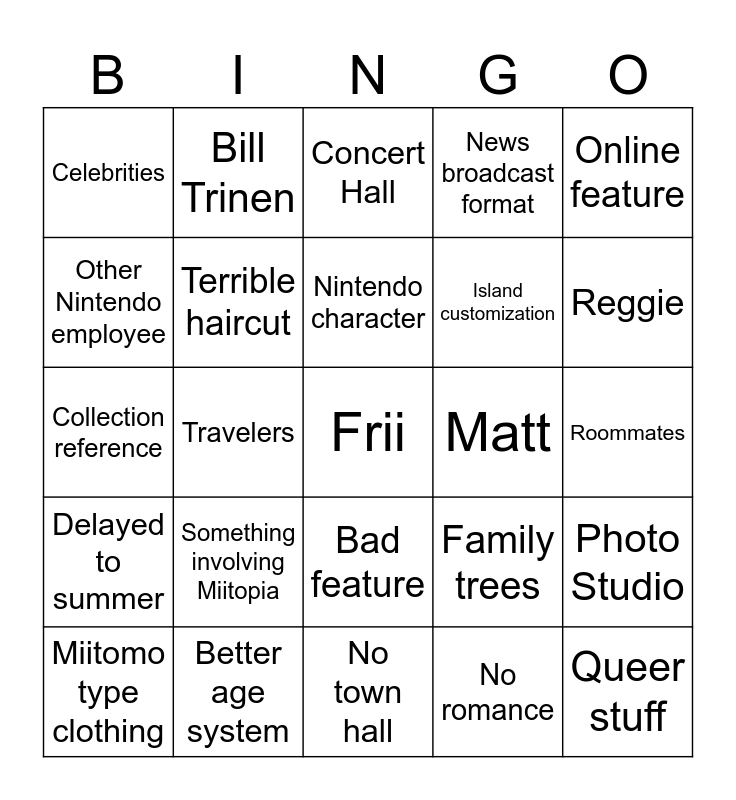 This bingo card has a free space and 24 words: Something involving Miitopia, Better age system, Nintendo character, Miitomo type clothing, Online feature, Celebrities, Other Nintendo employee, Bill Trinen, Matt, Bad feature, Island customization, Collection reference, Family trees, Photo Studio, Terrible haircut, No romance, Roommates, Concert Hall, Reggie, Travelers, Queer stuff, Delayed to summer, News broadcast format and No town hall.