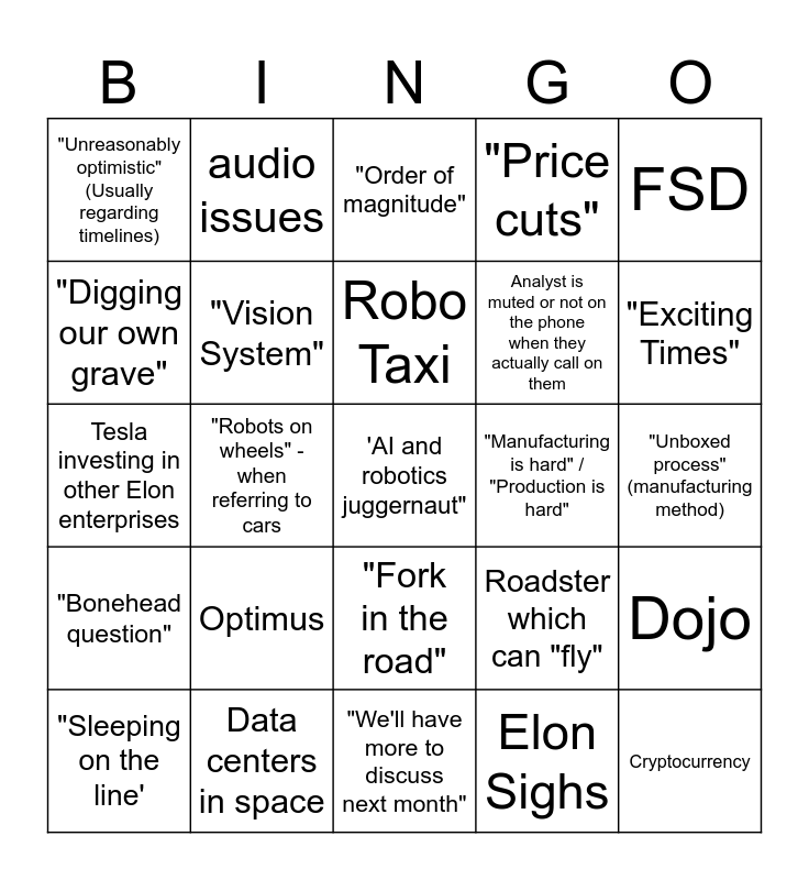 This bingo card has 37 words: Magic cat, Elevator analogy, "An economy where currency is energy", "Vision System", Dojo, Optimus, Robo Taxi, Cybertruck, FSD, 4680 Cells, "Robots on wheels" - when referring to cars, "Price cuts", 'AI and robotics juggernaut", "Unboxed process" (manufacturing method), "Digging our own grave", "Bonehead question", "Not many people understand this", "Order of magnitude", "Fork in the road", "Manufacturing is hard" / "Production is hard", "Unreasonably optimistic" (Usually regarding timelines), "Exciting Times", "Sleeping on the line', "We'll have more to discuss next month", "March of nines" - referring to autonomy safety level, Elon Sighs, audio issues, Mentioning twitter/x/doge, "infinite money hack", "you can't have the right answer if you ask the wrong question", Government Inefficiency, Data centers in space, Tesla investing in other Elon enterprises, Cryptocurrency, Roadster which can "fly", Analyst is muted or not on the phone when they actually call on them and New product launch that isn't model Y but is actually a model y with a mustache.