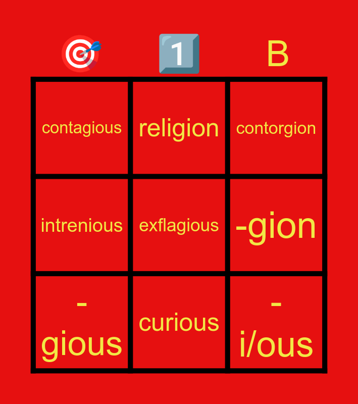 This bingo card has a free space and 8 words: -gion, contorgion, religion, -gious, contagious, -i/ous, intrenious and curious.