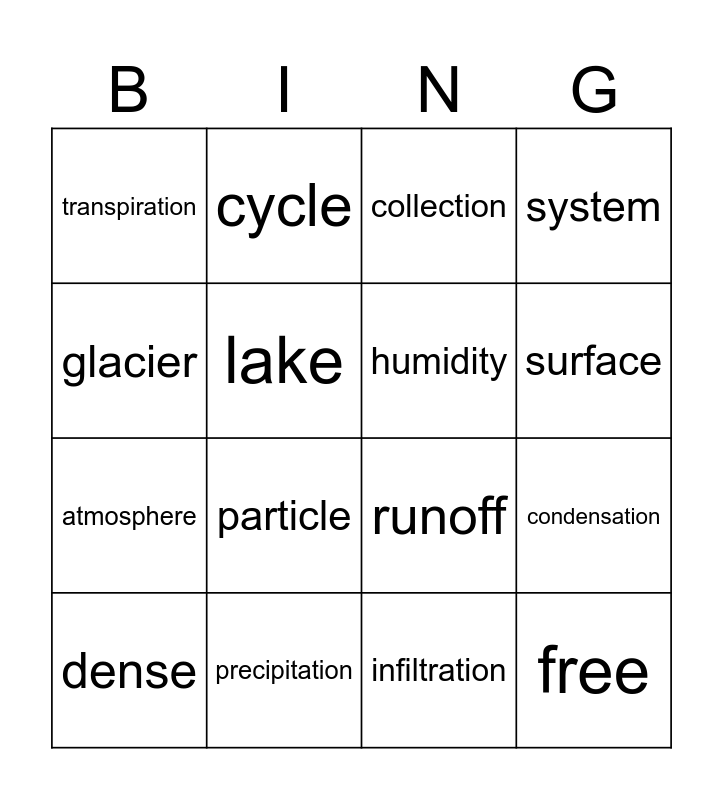 This bingo card has 16 words: precipitation, condensation, collection, transpiration, atmosphere, cycle, runoff, infiltration, glacier, lake, dense, system, particle, surface, humidity and free.