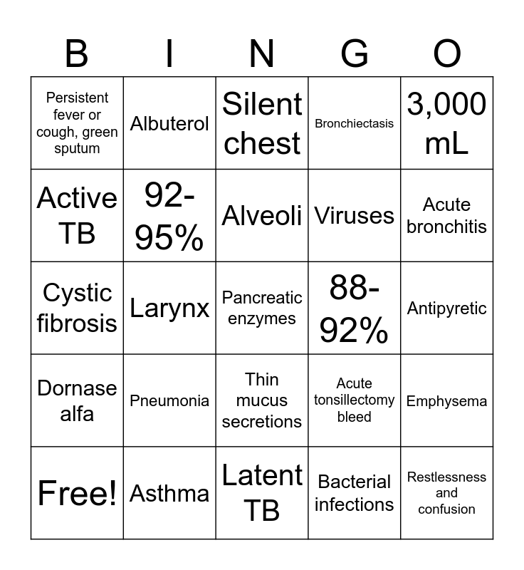 This bingo card has 27 words: Acute tonsillectomy bleed, Restlessness and confusion, Viruses, Latent TB, Active TB, Silent chest, Albuterol, Dornase alfa, 88-92%, Emphysema, Cystic fibrosis, Bronchiectasis, Free!, Asthma, Acute bronchitis, High fowlers, pursed lip breathing, 92-95%, Alveoli, Pneumonia, Persistent fever or cough, green sputum, Antipyretic, Bacterial infections, Larynx, Pancreatic enzymes, Thin mucus secretions, 3,000 mL and 2,000 mL.