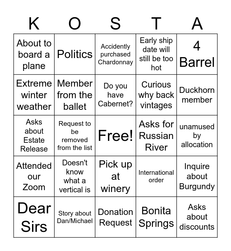 This bingo card has a free space and 24 words: Doesn't know what a vertical is, Story about Dan/Michael, Do you have Cabernet?, Dear Sirs, 4 Barrel, About to board a plane, Extreme winter weather, Politics, Asks for Russian River, Pick up at winery, Curious why back vintages, Asks about Estate Release, International order, Inquire about Burgundy, Member from the ballet, Bonita Springs, unamused by allocation, Accidently purchased Chardonnay, Duckhorn member, Request to be removed from the list, Asks about discounts, Attended our Zoom, Early ship date will still be too hot and Donation Request.