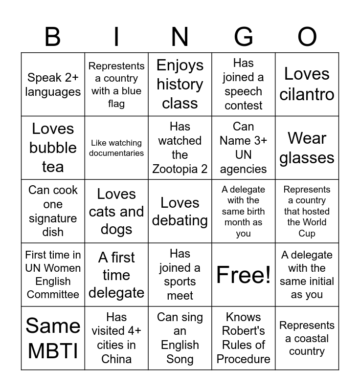 This bingo card has 25 words: A first time delegate, Can sing an English Song, Has watched the Zootopia 2, Same MBTI, Loves cilantro, Speak 2+ languages, Loves bubble tea, Represtents a country with a blue flag, A delegate with the same birth month as you, Has joined a sports meet, Can Name 3+ UN agencies, Can cook one signature dish, Free!, A delegate with the same initial as you, Like watching documentaries, Represents a coastal country, Represents a country that hosted the World Cup, Enjoys history class, Wear glasses, Loves cats and dogs, Loves debating, Has visited 4+ cities in China, First time in UN Women English Committee, Has joined a speech contest and Knows Robert's Rules of Procedure.