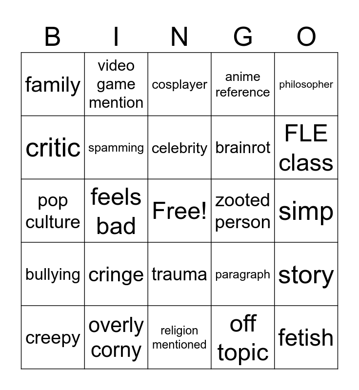 This bingo card has a free space and 24 words: cringe, overly corny, celebrity, creepy, philosopher, family, critic, video game mention, zooted person, trauma, brainrot, pop culture, paragraph, story, spamming, off topic, simp, cosplayer, FLE class, feels bad, fetish, bullying, anime reference and religion mentioned.